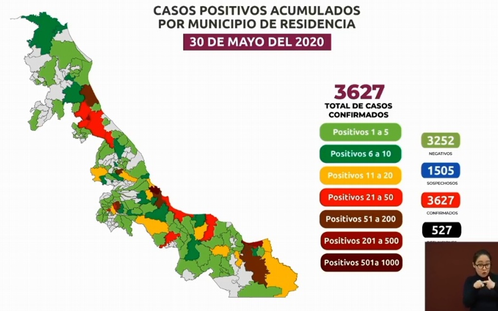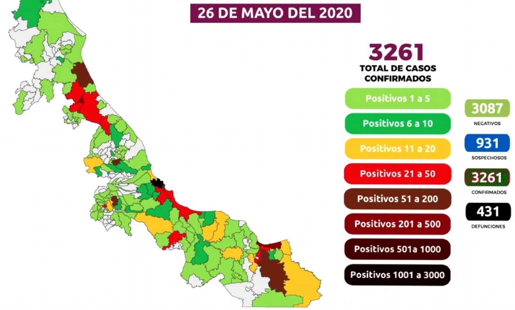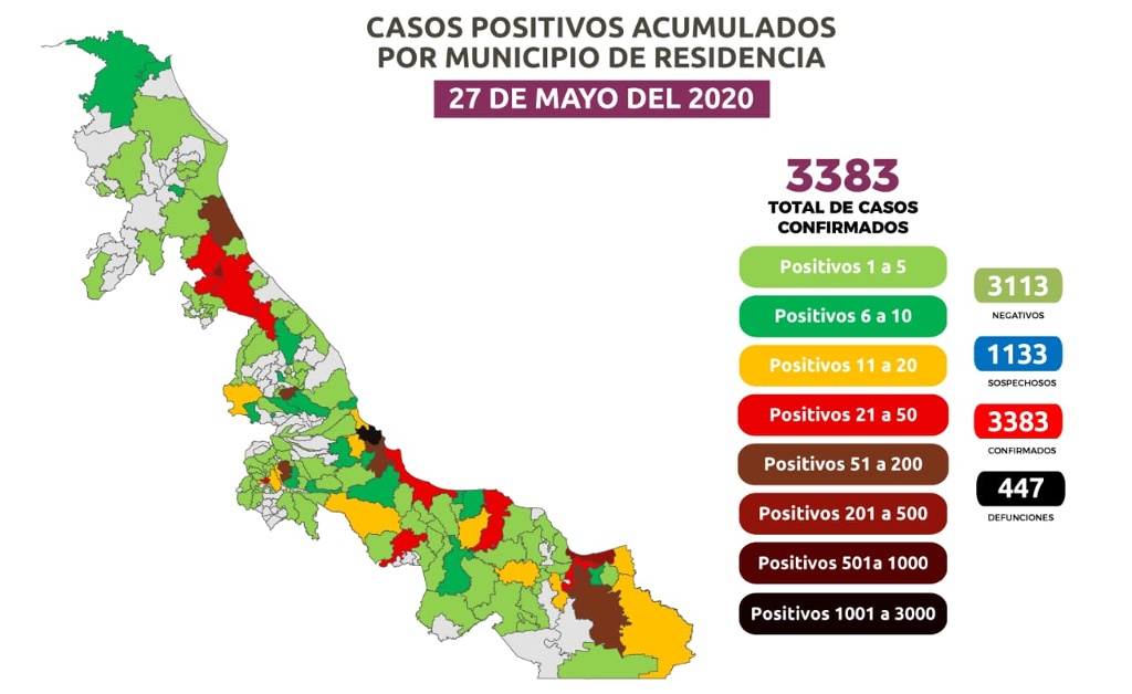 Los 3 mil 627 casos positivos se ubican en 134 demarcaciones: Veracruz 1377, Coatzacoalcos 437, Poza Rica 319, Boca del Río 176, Minatitlán 158, Tuxpan 91, Córdoba 74, Xalapa 59, Medellín 58, Cosoleacaque 57, Papantla 50, Coatzintla 42, Orizaba 37, Tihuatlán 33, Alvarado 32, Cosamaloapan 28; Martínez de la Torre, Nanchital y San Andrés Tuxtla 23; Fortín 21; La Antigua y Las Choapas 20; Agua Dulce, Perote y Tierra Blanca 19.