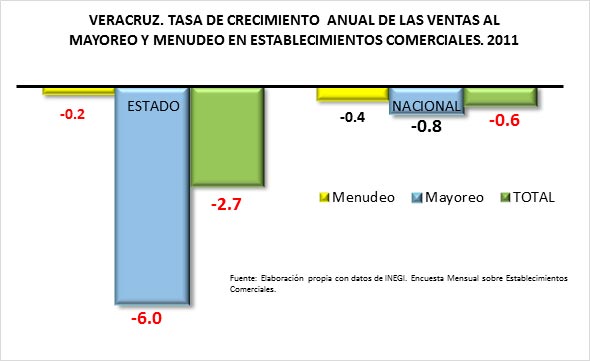 El valor de la ventas comerciales en Veracruz mostraron una profunda caída durante el año pasado. A lo largo de los ocho primeros meses de 2011 las "Ventas Totales", cayeron un -2.7%, lo cual es una situación más adversa que la observada a nivel nacional, donde la reducción fue de sólo -0.6%.