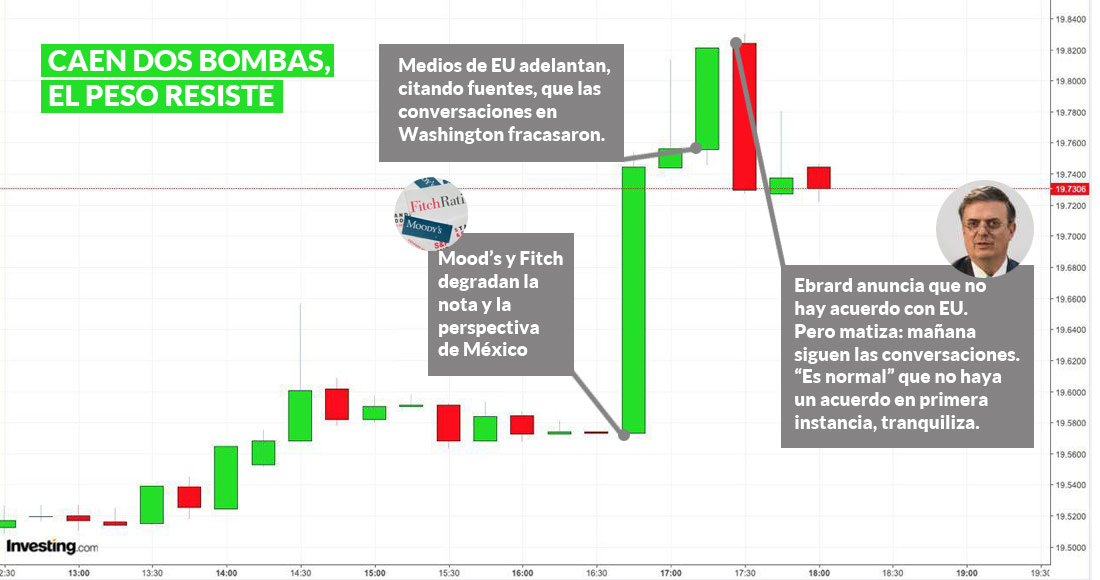Ciudad de México, 5 de junio (SinEmbargo).- El peso mexicano vivió hoy una tarde de montaña rusa. Primero, dos calificadoras salieron al mismo tiempo a anunciar un castigo en sus notas y en sus perspectivas para la economía del país. Después, medios internacionales adelantaron la noticia de que no había un acuerdo en primera instancia con Estados Unidos para evitar una subida de aranceles el próximo lunes, como amenaza Donald Trump.