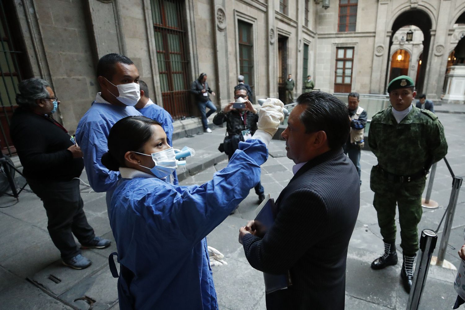 Personal médico toma la temperatura de los periodistas que asisten a la rueda de prensa matutina del presidente Andrés Manuel López Obrador. FOTO: EFE / VIDEO: EPV