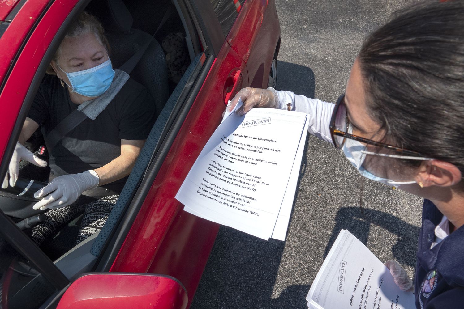 Una representante del Ayuntamiento de Hialeah, Florida, reparte documentos para solicitar los beneficios por desempleo. En vídeo, la pérdida de empleos en EE UU. FOTO | VIDEO: EFE