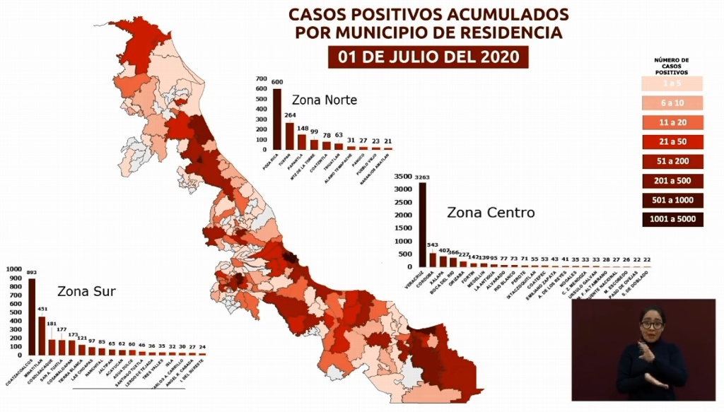 Indicó que en la entidad se tiene un acumulado de 10 mil 522 casos confirmados desde el inicio de la pandemia en el territorio veracruzano; de los cuales mil 195 son actuales.